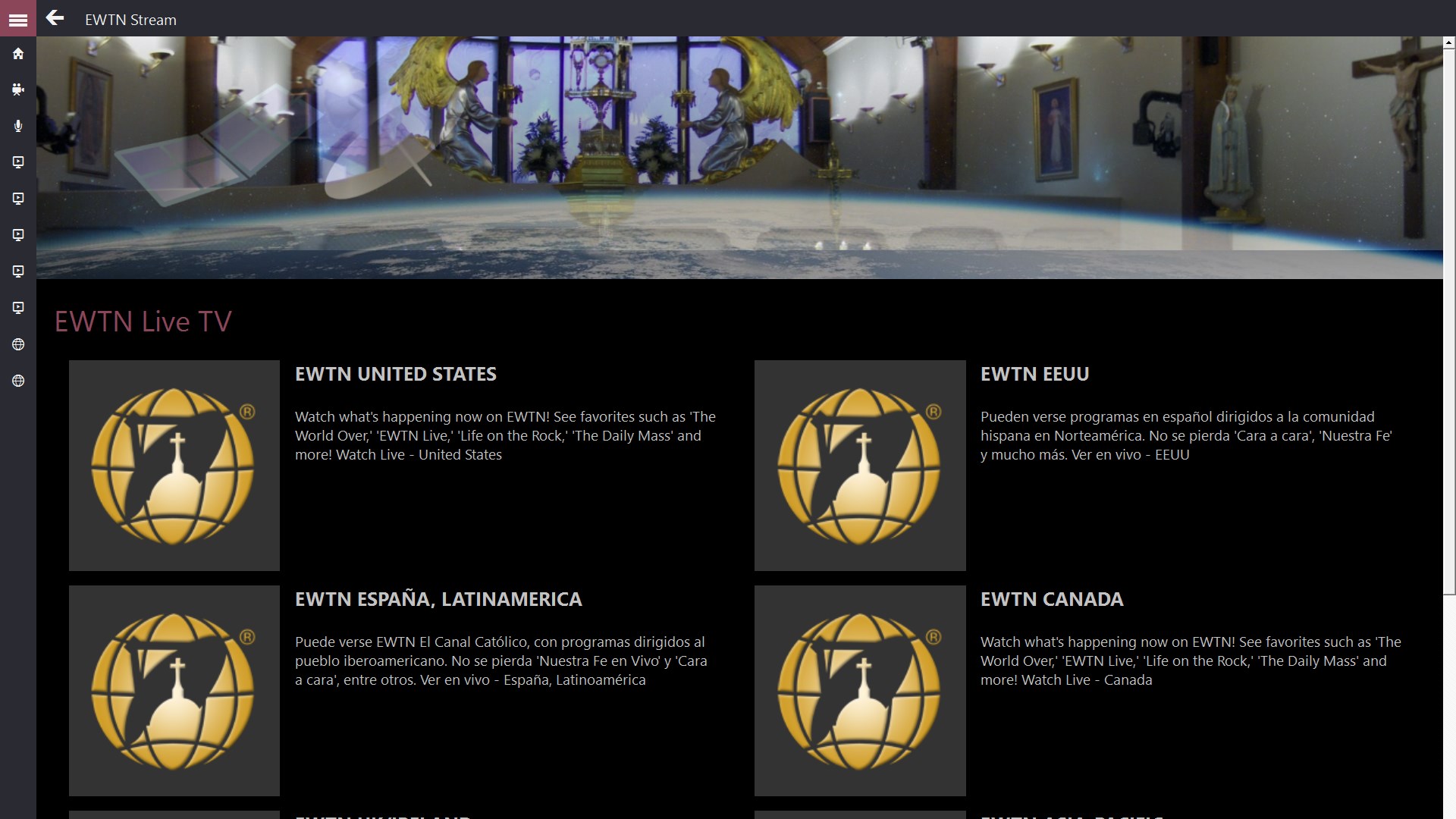 EWTN television is literally everywhere reaching viewers on a wide range of traditional and emerging technologies. You can enjoy EWTN Live Streams TV Radio many of the popular TV and Radio shows On Demand prayers and devotionals and keep up on the latest Catholic news. Transmisión en vivo del canal en español de EWTN.
